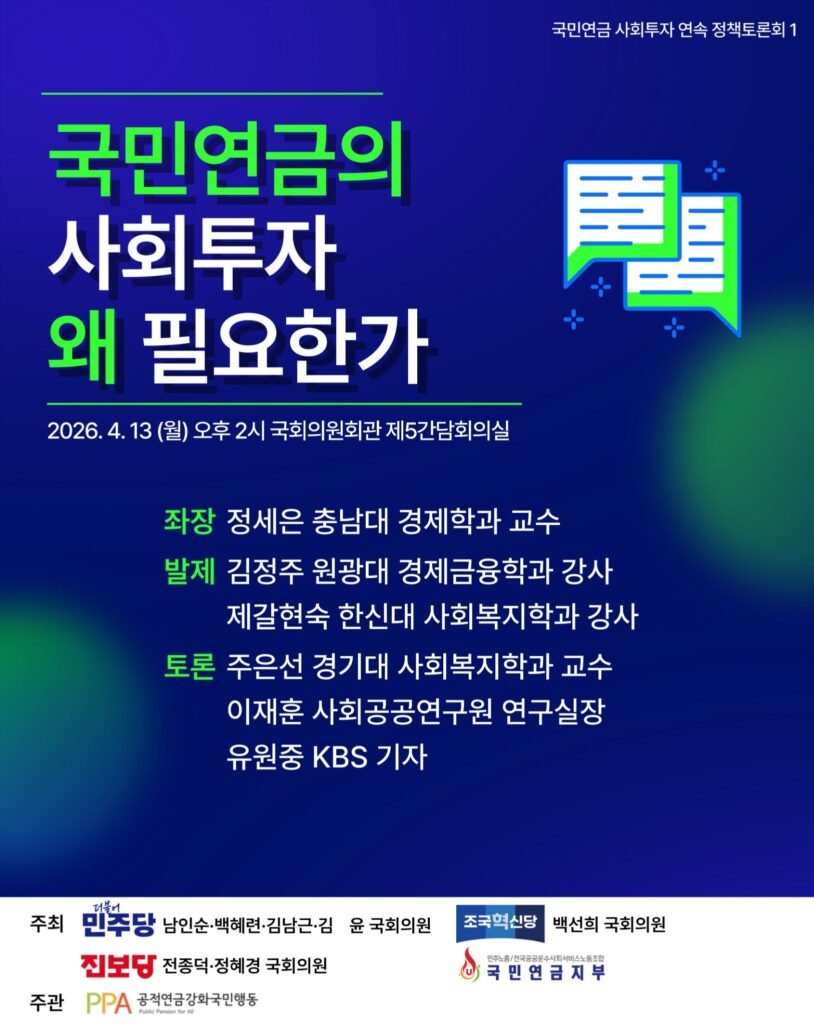 - 주최: 더불어민주당 남인순·백혜련·김남근·김윤 국회의원, 조국혁신당 백선희 국회의원, 진보당 전종덕·정혜경 국회의원, 공공운수노조 국민연금지부